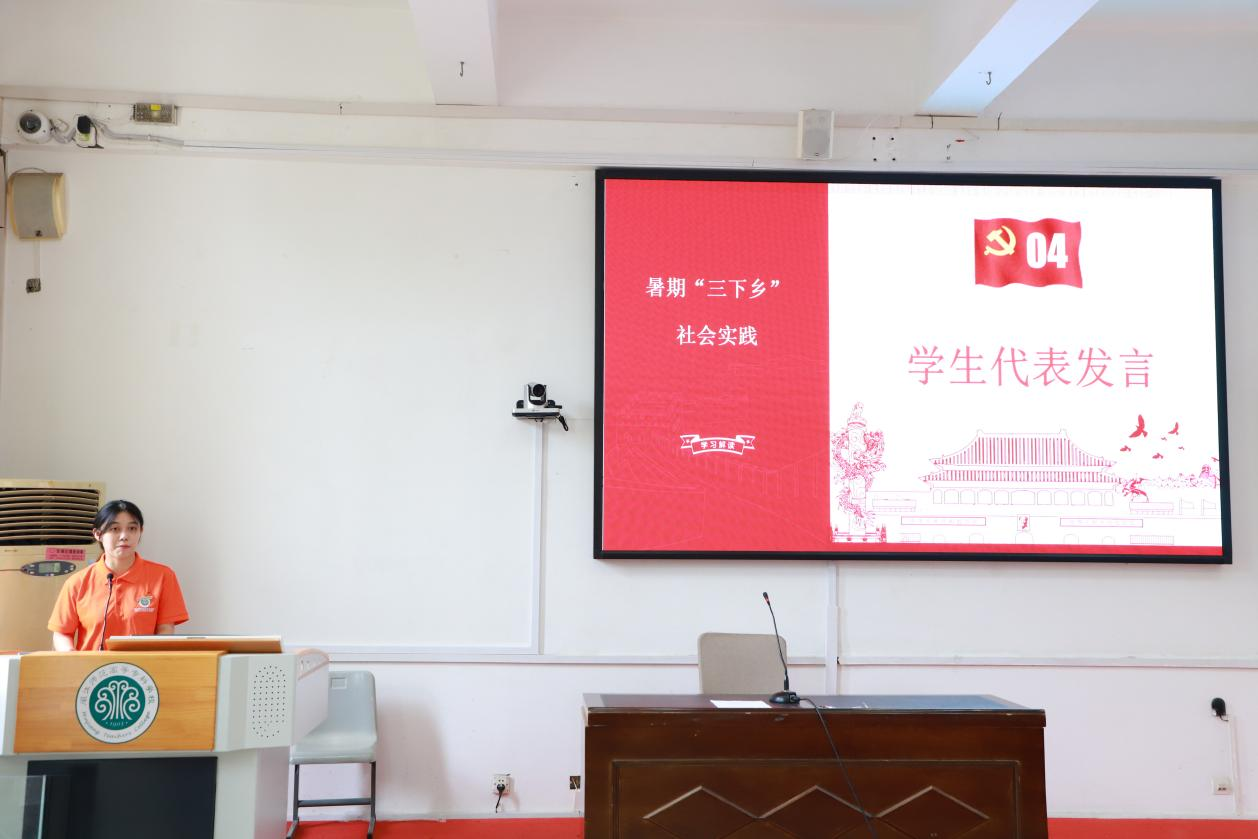 授旗完毕后,校青年志愿者协会沈君作为学生代表发言,她表示本次“三下乡”是对自我意志和协作能力的磨砺,以本次实践活动为载体,在实现中华民族伟大复兴的路上吹响闽师专学子的号角。