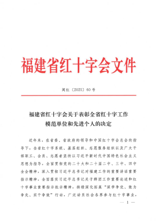日前,福建省红十字会正式印发《福建省红十字会关于表彰全省红十字工作模范单位和先进个人的决定》(闽红〔2025〕60号),我校红十字会凭借在红十字事业领域的扎实实践与突出成效,成功获评“福建省红十字工作模范单位”。