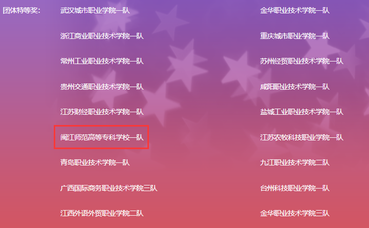 本次大赛共有1207支参赛队(其中本科组595支、高职组573支、中职组39支),共计3621名选手参加了此次比赛。由外语商贸学院傅雅凌、肖怡文老师带队的来自应用英语专业的6名、共2队参赛选手,经过3天的比赛,获得高职一站团体特等奖,以及高职二站团体一等奖,学生个人奖项跟随团体奖。