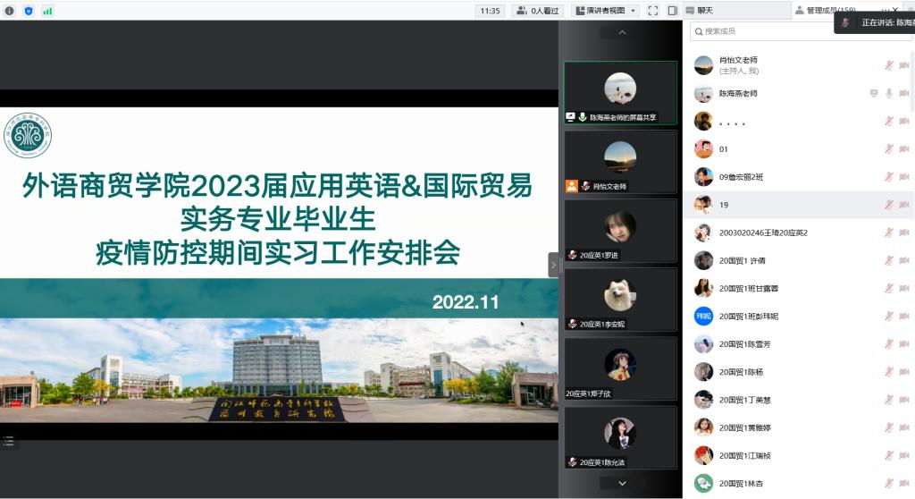 为保障在疫情防控期间安全、有序地开展毕业生实习工作,11月3日商贸教研室于线上召开2023届应用英语和国际贸易实务专业毕业生实习工作安排视频会议。2020级国贸和应英专业全体学生参加本次会议,会议由商贸教研室主任陈海燕主持。