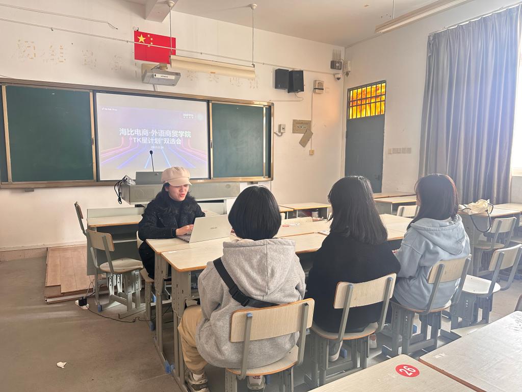 为紧密对接跨境电商行业的发展趋势,以市场需求为导向进行人才培养,2月24日下午,外语商贸学院与海比跨境电商校企合作工作室在海口校区405教室举办“TikTok星计划”双选会。会议面向22级国际经济与贸易、应用英语专业学生,海比跨境电商TikTok事业部负责人范青青,“TikTok星计划”海口校区班主任傅雅凌老师参加了此次双选会。