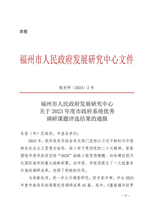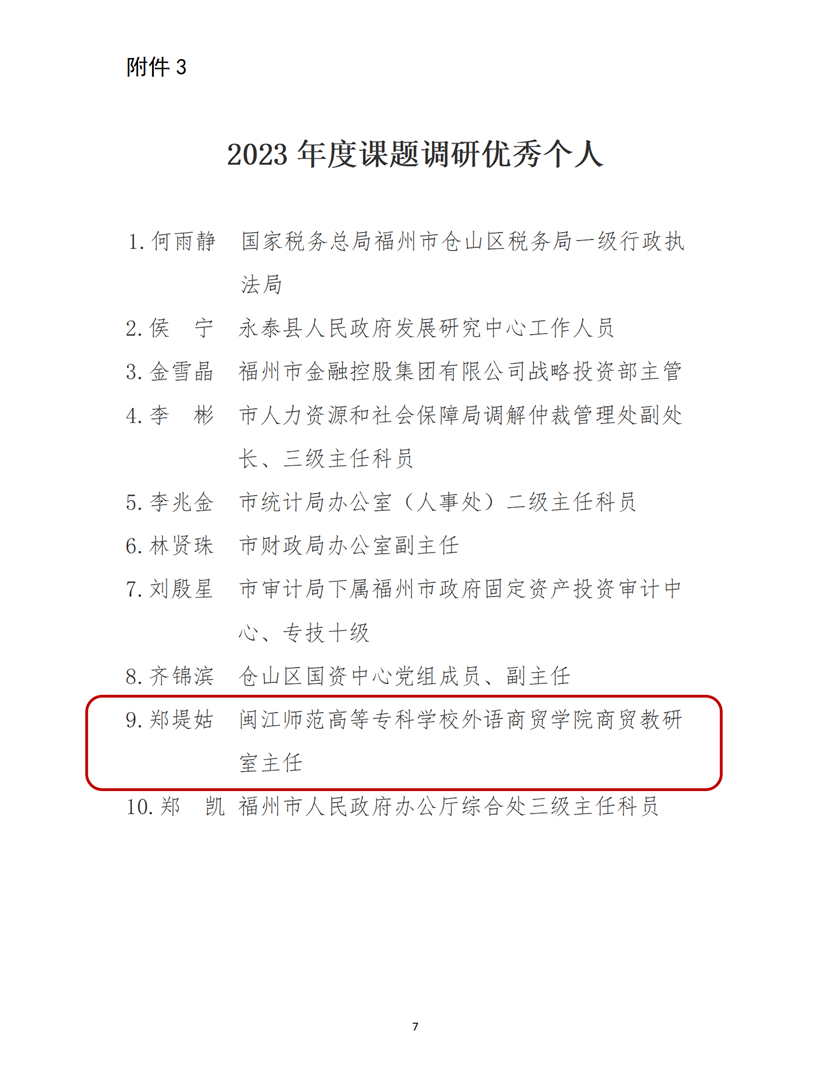 近日,福州市人民政府发展研究中心发布了“2023年度市政府系统优秀调研课题”评选结果,我院商贸教研室主任郑堤姑荣获“课题调研优秀个人”。