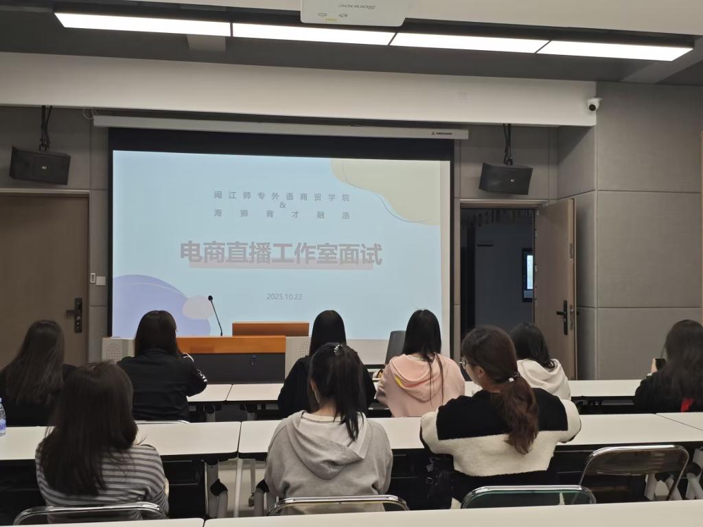 2025年10月22日,外语商贸学院与福州市海狮育才融浩人力资源有限公司联合共建的 “电商直播实战工作室”,在旗山校区产创楼304教室启动首批学生面试,标志着该项目进入实质性选拔阶段。