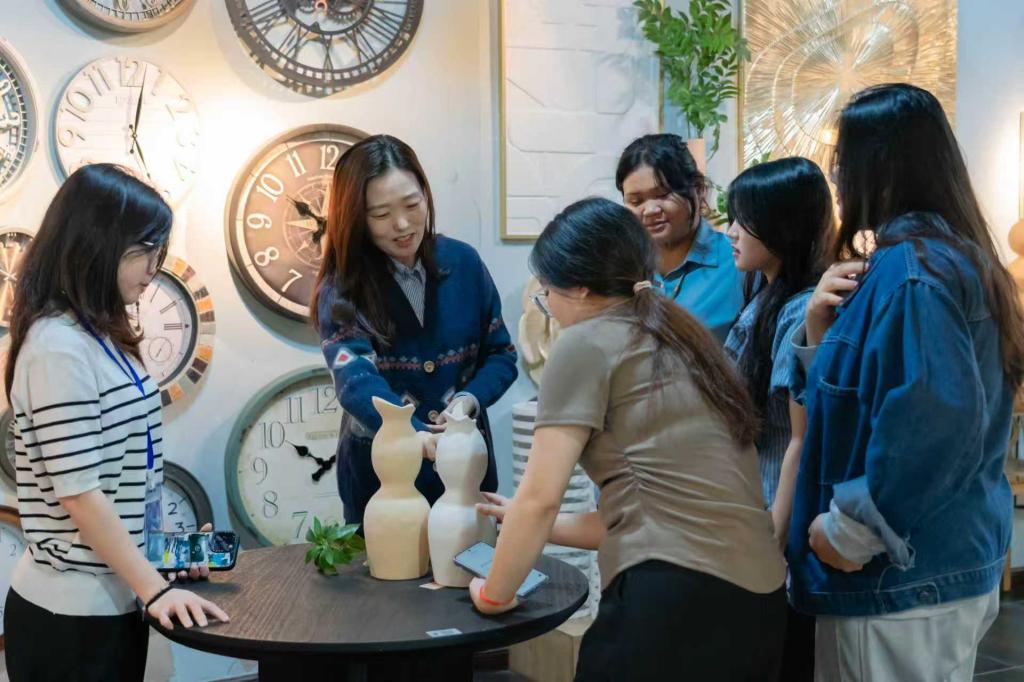 陈永斌主任带领留学生们参观了企业文化成果展室,结合企业近20年的发展历程,系统介绍了弘博工艺的核心业务、创新理念与全球布局,并重点分享了公司“以创新为核心”的发展战略。期间,留学生们认真聆听,不时驻足询问,对企业的发展路径有了深刻理解。随后,留学生们走进公司产品陈列室,近距离接触各类家居装饰工艺品,详细了解产品设计理念、材质工艺与市场定位。