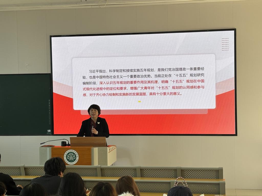 本次授课以《深刻认识五年规划重大作用积极关注和参与“十五五”规划》为主题。林书记开篇先以时间为轴,通过梳理“一五”到“十四五”规划(计划)实施以来我国在经济发展、科技创新、民生改善等领域取得的标志性成就,用“嫦娥探月”“天问巡火”的航天突破、脱贫攻坚的全面胜利等鲜活案例,直观展现了五年规划(计划)在国家发展中的“指南针”作用。在解读“十五五”规划编制的时代背景时,她结合当前国际国内发展形势,深入分析了规划编制面临的机遇与挑战,强调“十五五”规划是衔接“两个一百年”奋斗目标的关键规划,与国家未来发展方向和青年成长成才紧密相关。授课过程中,林书记特别注重与学生互动,通过“你眼中的五年变化”“青年能为‘十五五’做什么”等提问引发讨论,同学们积极举手发言,分享自身感受与思考。她还鼓励学生通过政府官网等渠道主动了解规划内容,将个人专业学习与国家战略需求相结合。