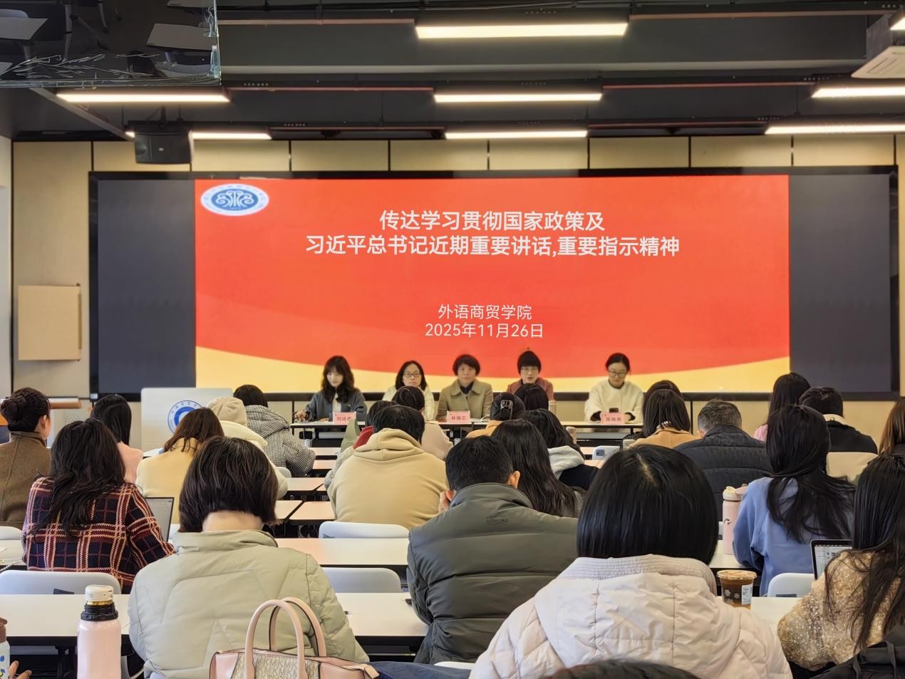 2025年11月26日下午,外语商贸学院于产创楼307会议室召开全院教职工学习会议。学院党总支书记林锦芯、院长何少娴、副书记卢燕红、副院长陈海燕、副院长刘诗雨及全体教职工参会。会议由刘诗雨副院长主持。