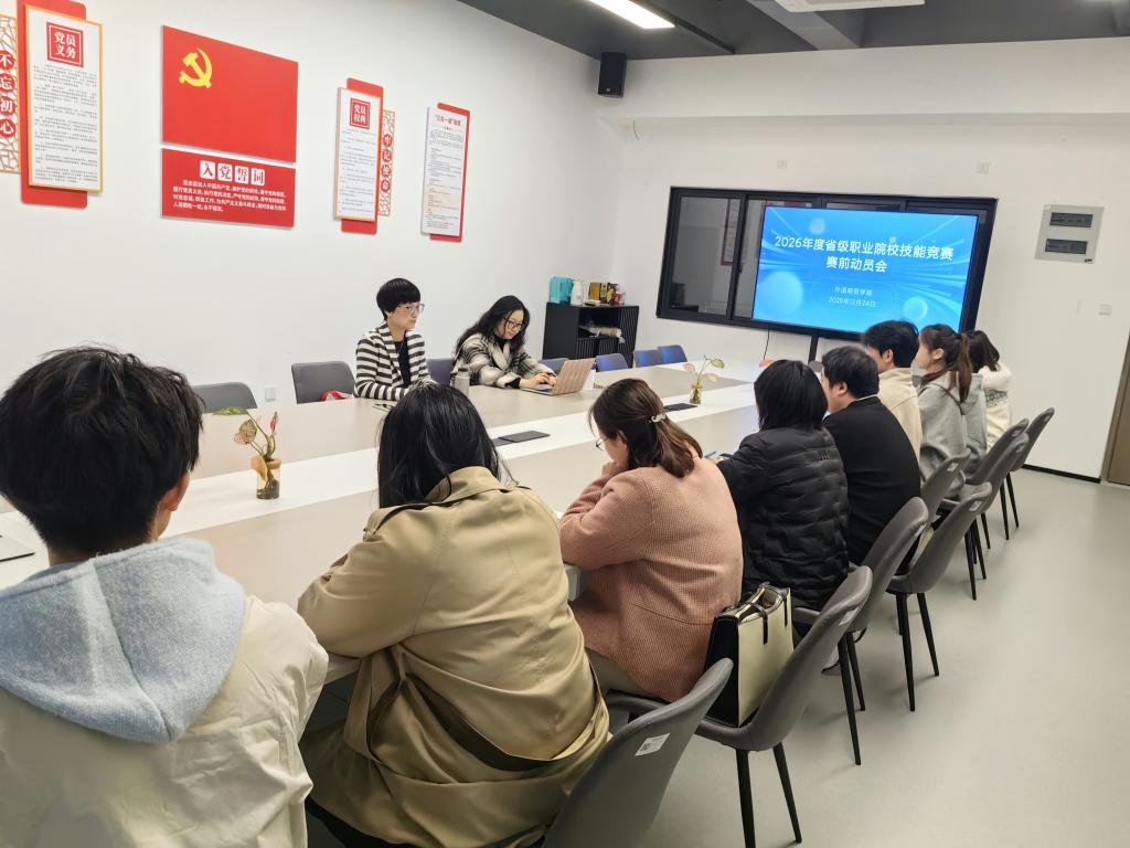 为鼓舞士气、凝聚共识,助力参赛师生以最佳状态迎接挑战,12月24日下午,外语商贸学院在产创楼303会议室召开2026年度省级职业院校技能竞赛赛前动员会。外语商贸学院何少娴院长、陈海燕副院长出席会议,各参赛团队的指导老师及学生代表共同参会。
