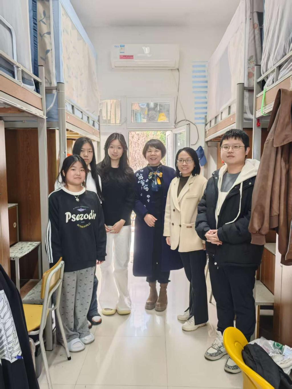 临近期末和寒假,为进一步强化学生安全意识,排查宿舍安全隐患,2025年12月30日,外语商贸学院党总支书记林锦芯、副书记卢燕红带领辅导员深入学生宿舍,开展期末宿舍安全专项检查及假期安全教育活动,并慰问正在紧张备考的学生。