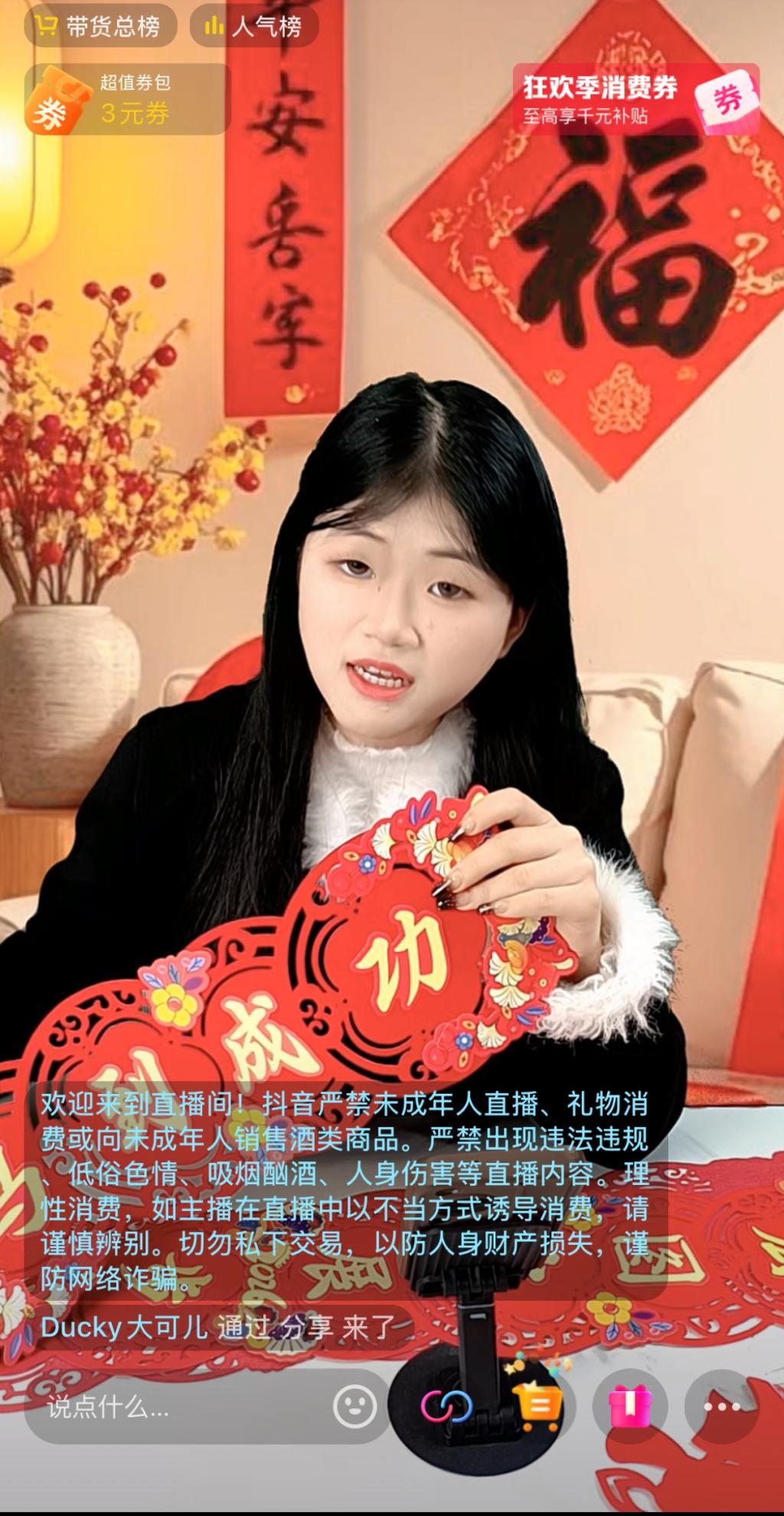 春节期间,经过上学期系统实战训练的订单班学生们化身“新春带货官”,聚焦新年装饰品、地方特色农副产品两大核心品类,开展多场专场直播。镜头前,学生主播们凭借日渐熟练的直播话术、灵活的互动技巧和专业的产品讲解,充分展现了实战训练的丰硕成果,直播间氛围活跃,订单稳步增长。其中,农副产品板块表现尤为突出,单场直播用户支付金额超3000元,既帮助合作农户拓宽了销售渠道,也让学生在实践中深刻体会到电商行业的社会价值,实现了技能提升与责任担当的双重收获。