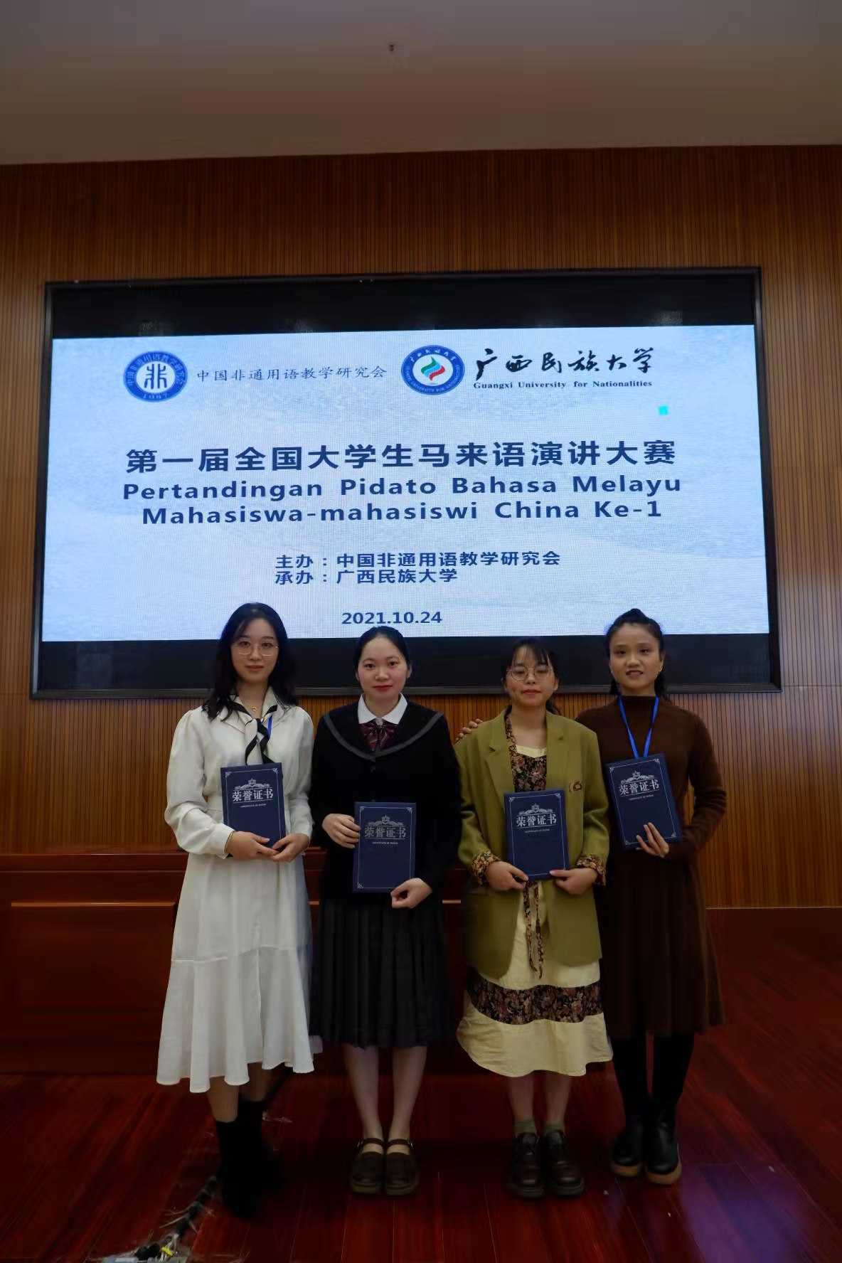 10月23日-24日,第一届“全国大学生马来语演讲大赛”在广西南宁广西民族大学大学(西校区)图书馆报告厅举行。我校外语系应用外语专业(马来语方向)2019级学生陈玉婷、2020级学生陈羽情在马来语教师金曦、王心宜的带领下参赛,获得了两个全国三等奖的好成绩。