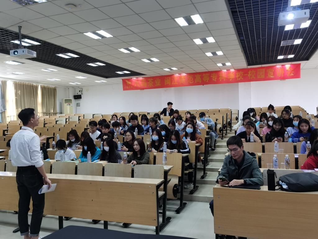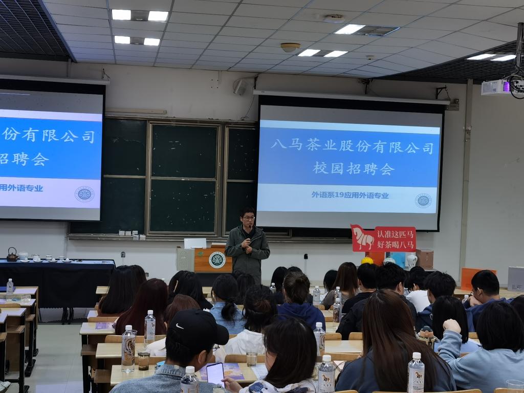 2021年10月26日,八马茶业股份有限公司人资经理林海峰携工作团队一起入校在3018教室对我系应用外语专业学生开展校园招聘。应用外语教研室全体教师和19级应用外语毕业生参加了招聘会。