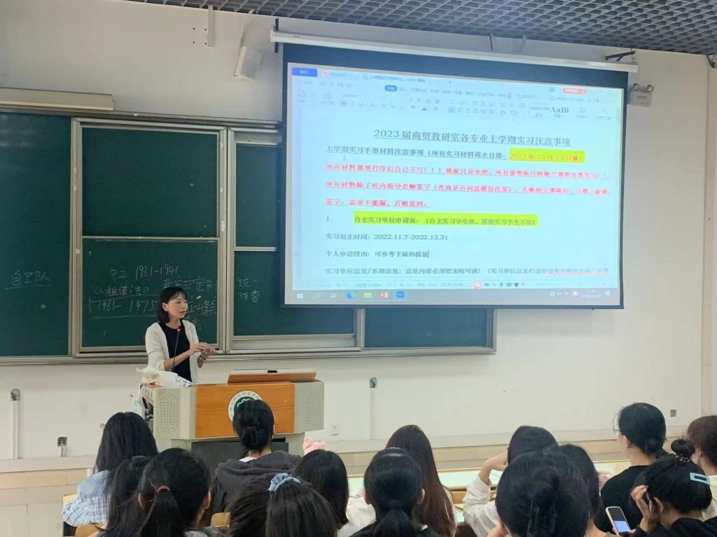 为落实人才培养方案,加强教学实践环节,保障商贸教研室2023届学生实习工作顺利开展,商贸教研室于10月12日中午在1018教室召开毕业实习动员会。商贸教研室主任陈海燕老师、副主任肖怡文老师、教师代表肖阜老师以及2023届应用英语专业和国际贸易实务专业的全体同学参加了此次会议。