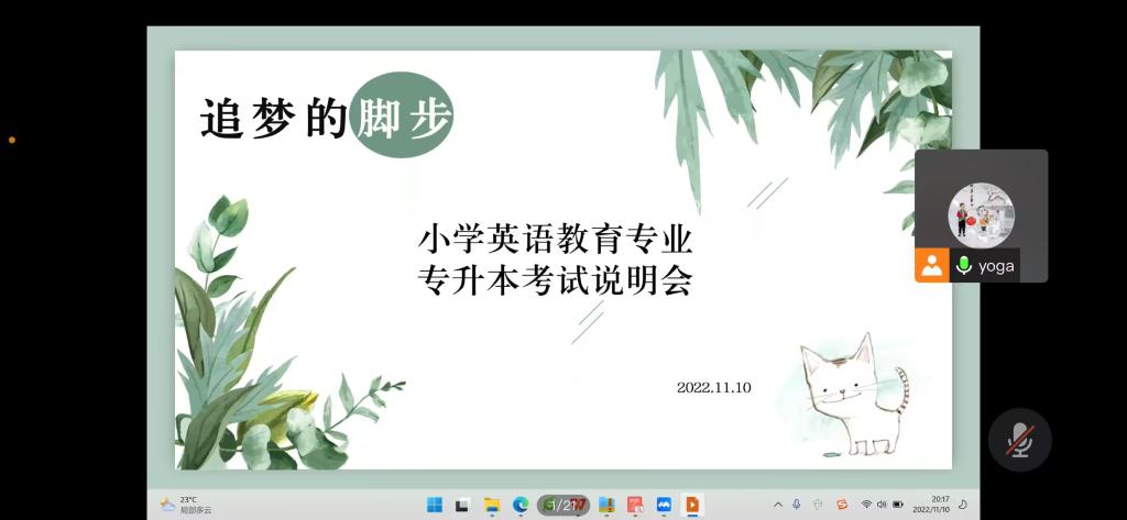 近日,福建省教育厅公布《福建省普通高校专升本招考类别和考试说明》,为帮助学生更好地了解、理解我省普通高校专升本招考调整内容,11月10日,外语商贸学院小学英语教育专业通过腾讯会议召开了“专升本”考试说明会。会议由小学英语教育专业教研室主任尤佳老师主持,小学英语教育专业全体学生参加。