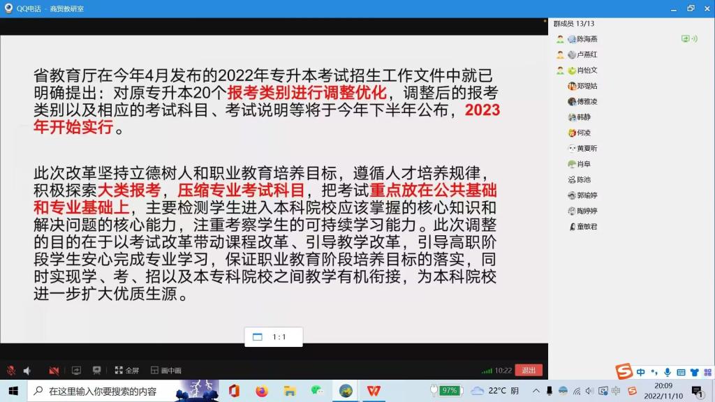 近日,福建省教育厅对福建省普通高校专升本考试招考类别和考试科目进行了调整,并公布《福建省普通高校专升本考试说明》。为适应专升本招考改革工作的要求,商贸教研室于11月10日召开2023年专升本考试说明会,会议由陈海燕老师主持。
