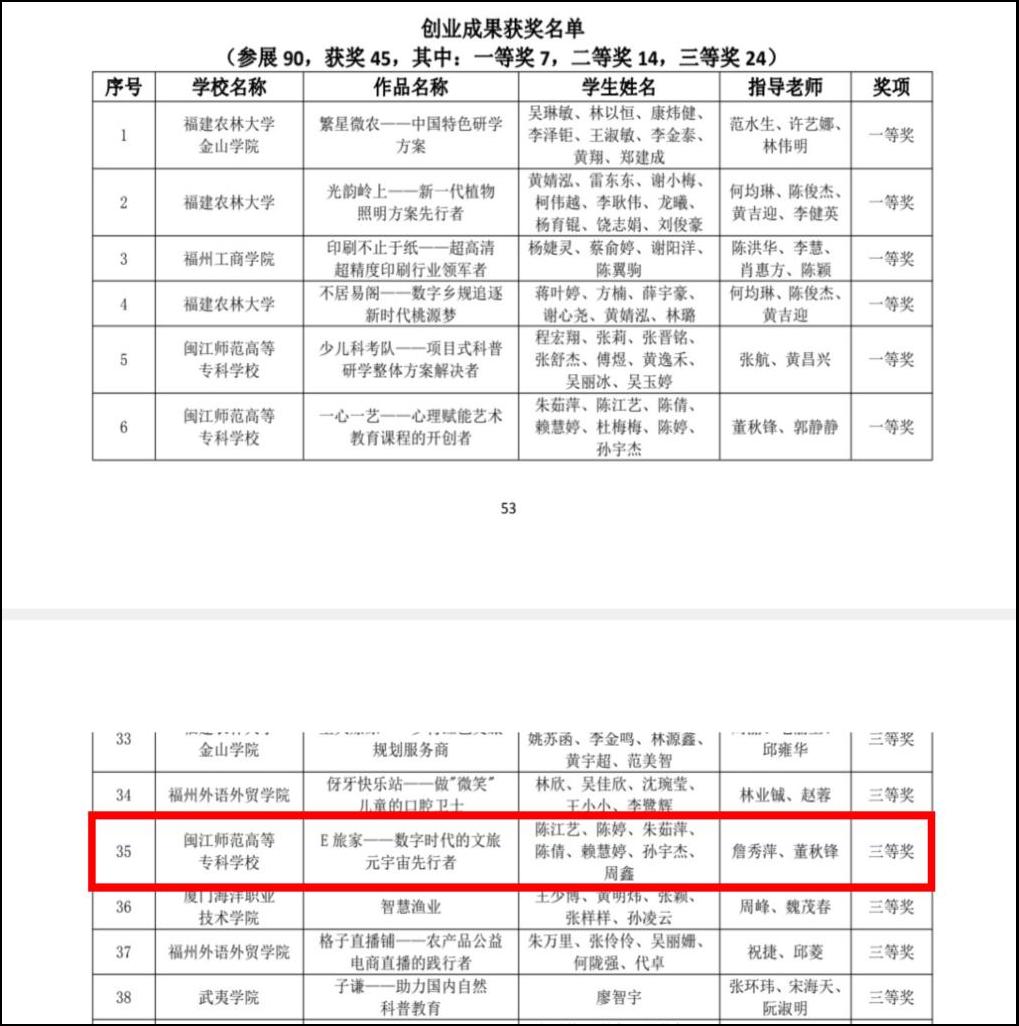 近日,由福建省教育厅、福建省人力资源和社会保障厅、平潭综合实验区管委会、福建省互联网信息办公室共同主办的“第九届海峡两岸暨港澳大学生职业技能大赛"获奖名单公布。由我院詹秀萍老师指导的学生项目《E旅家----数字时代的文旅元宇宙先行者》,荣获“第九届海峡两岸暨港澳大学生创新创业成果展”创业作品三等奖。同时,该项目在福建省第八届“互联网+”大学生创新创业大赛中喜获银奖。