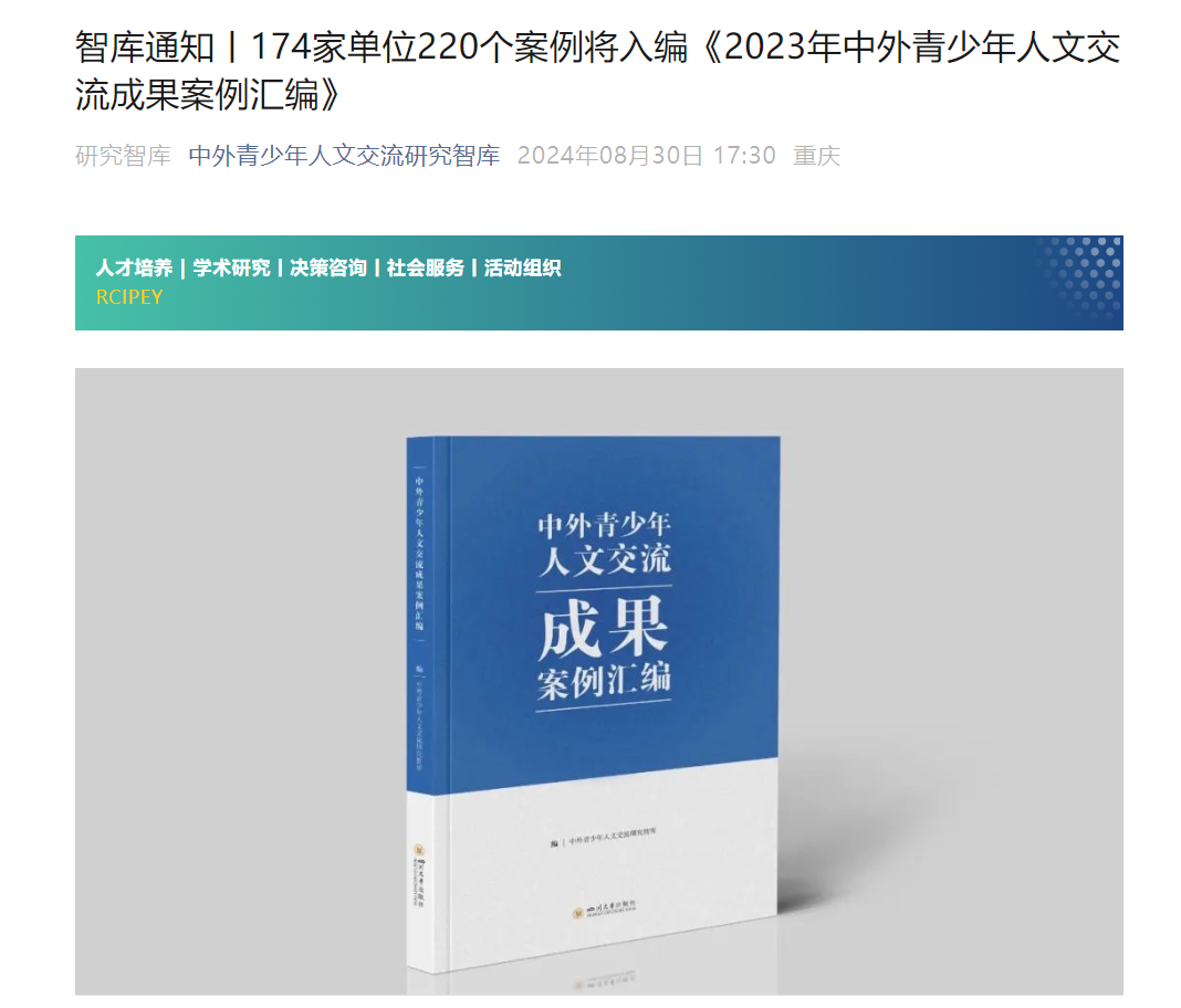 “中外青少年人文交流成果案例汇编活动”由教育部中外人文交流中心主办、中外青少年人文交流研究智库承办,旨在深化拓宽人文交流,强化教育理念传播与实践,推动教育国际合作及案例研究经验分享,服务教育高质量发展和立德树人的根本任务。
