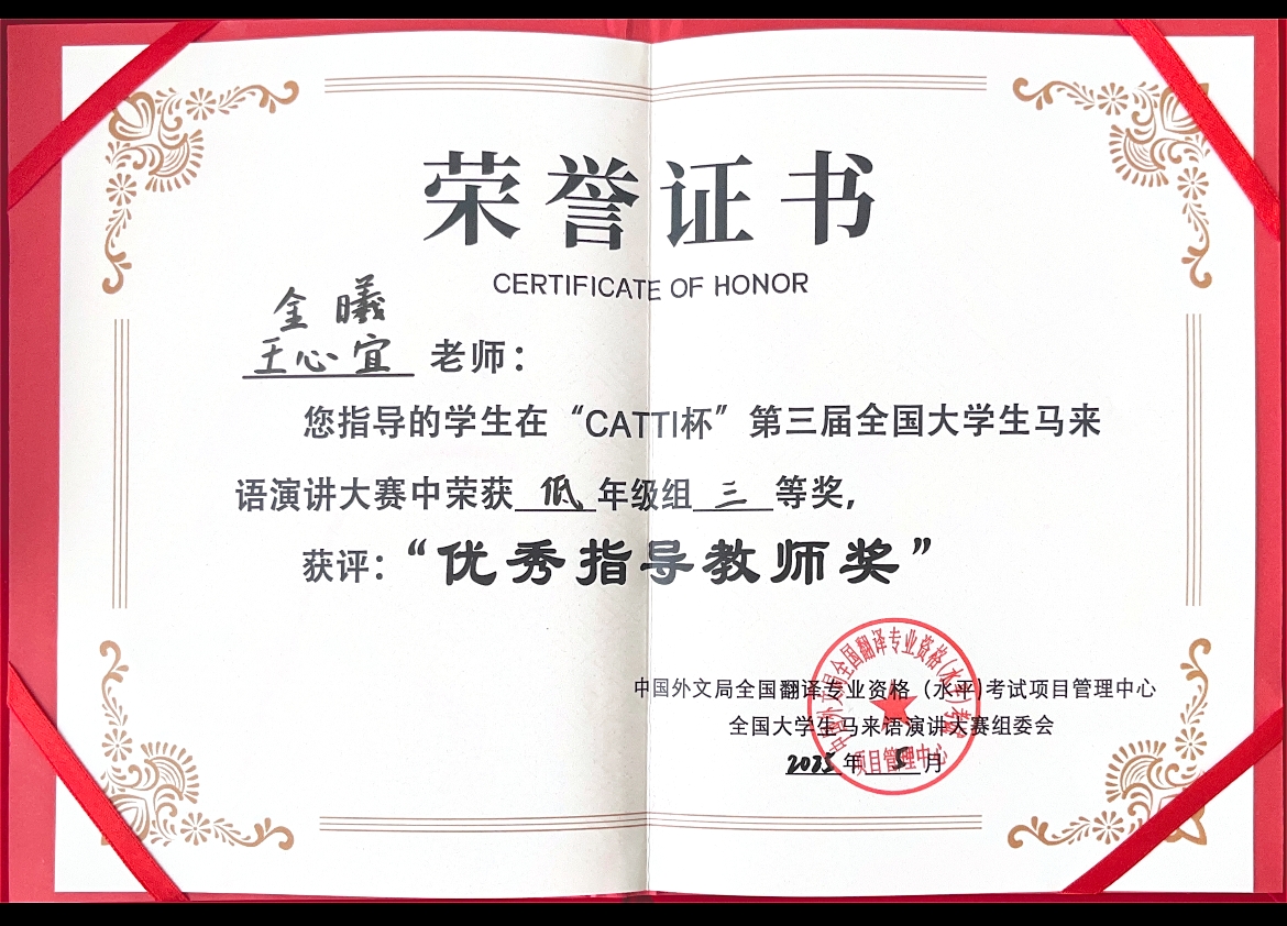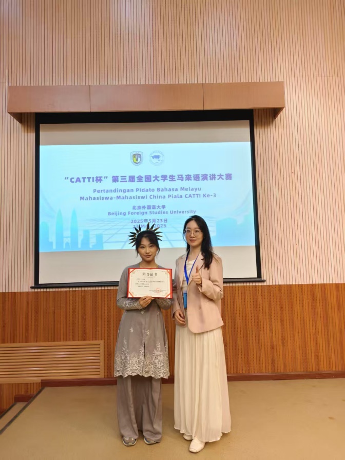 5月22日至23日,第五届中国—马来西亚翻译、语言与文化国际研讨会暨“CATTI杯”第三届全国大学生马来语演讲大赛在北京外国语大学举行。24级应用外语(马来语)专业学生林雪颖获低年级组三等奖,指导教师金曦、王心宜荣获优秀指导教师奖称号。