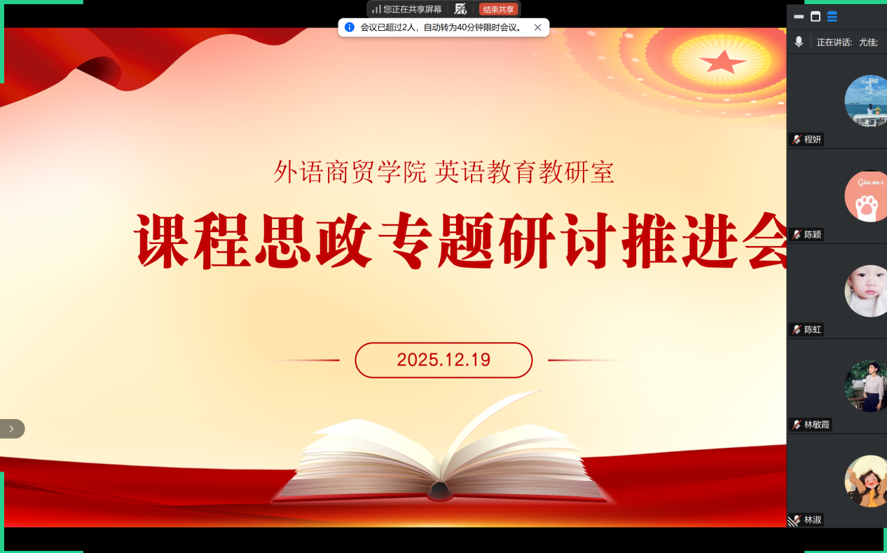 2025年12月19日,外语商贸学院小学英语教育教研室顺利召开本学期小学教育专业课程思政专题研讨推进会。会议由教研室主任尤佳主持,全体专业教师、外聘教师共同参与。会议以小学英语教育专业课程思政品牌“教育家精神”为核心,围绕课程思政建设实践成果、创新路径与未来方向展开研讨。
