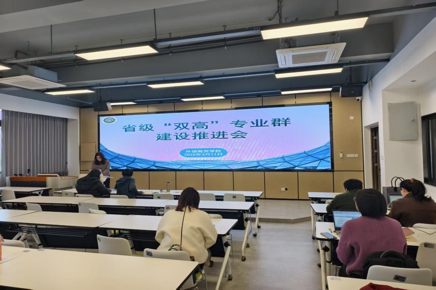 近日,外语商贸学院“跨境电商数智运营与服务专业群”成功获批福建省省级“双高”专业群建设单位。为推进第二期“双高计划”落地见效,紧扣“办学能力高水平、产教融合高质量”核心建设要求,助力福建省职业教育高质量发展,学院于2026年3月11日,在产创楼307召开省级“双高”专业群建设推进会,院长何少娴、副院长陈海燕、刘诗雨及各一级、二级指标落实人悉数参会。