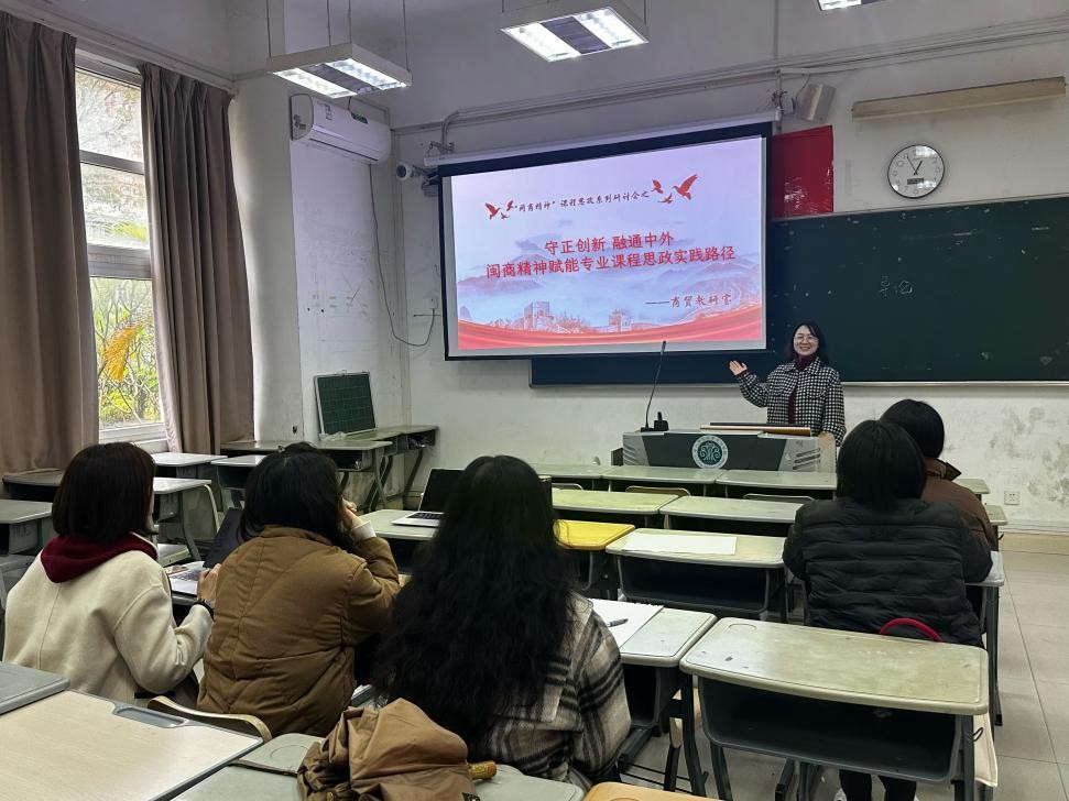 为持续深化课程思政建设,探索区域商业文化与专业教学的深度融合路径,12月25日中午,外语商贸学院商贸教研室成功举办第二期“闽商精神”课程思政建设专题研讨会。本次研讨会以“守正创新,融通中外:闽商精神赋能专业课程思政实践路径”为主题,由教研室主任郑堤姑主持,骨干教师及外聘教师参会,共同聚焦闽商精神在跨境电商专业课程中的实践应用。