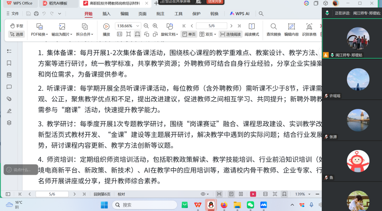 商贸教研室围绕专业概况、教学要求及学生学情开展培训,助力外聘教师快速熟悉岗位职责与教学流程,并结合职教政策与师德师风要求,夯实教学管理基础。