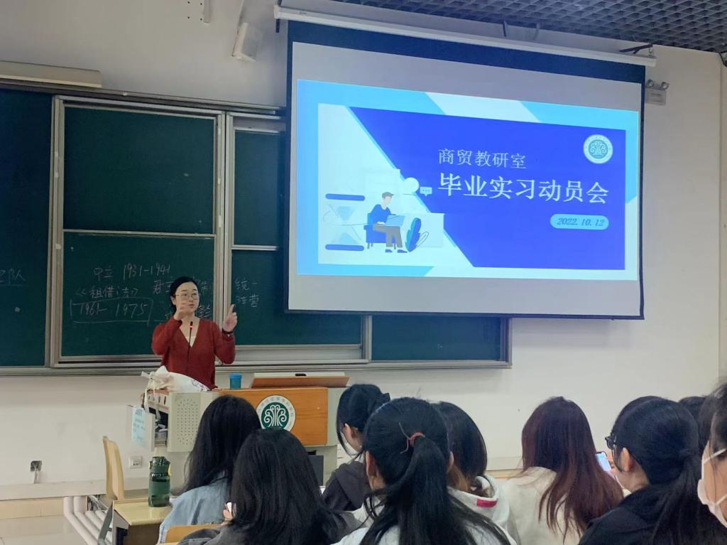 为落实人才培养方案,加强教学实践环节,保障商贸教研室2023届学生实习工作顺利开展,商贸教研室于10月12日中午在1018教室召开毕业实习动员会。商贸教研室主任陈海燕老师、副主任肖怡文老师、教师代表肖阜老师以及2023届应用英语专业和国际贸易实务专业的全体同学参加了此次会议。