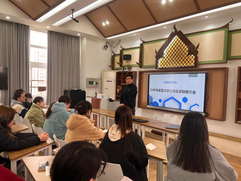 2023年2月22日中午,2023年马来亚大学交换生项目推介会于5002教室召开。学院副院长陈海燕、应用外语教研室主任林超、马来语教师王心宜及21级应用外语(马来语)专业学生出席本次会议。会议由林超老师主持。