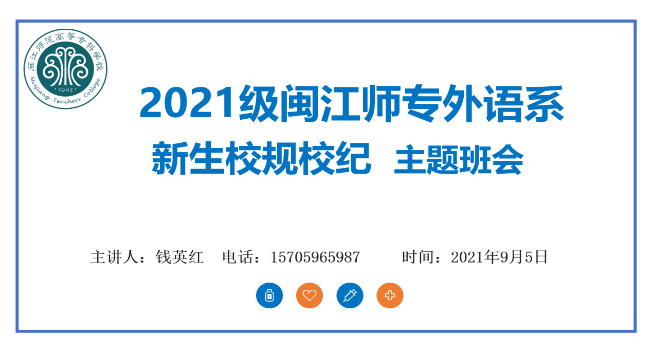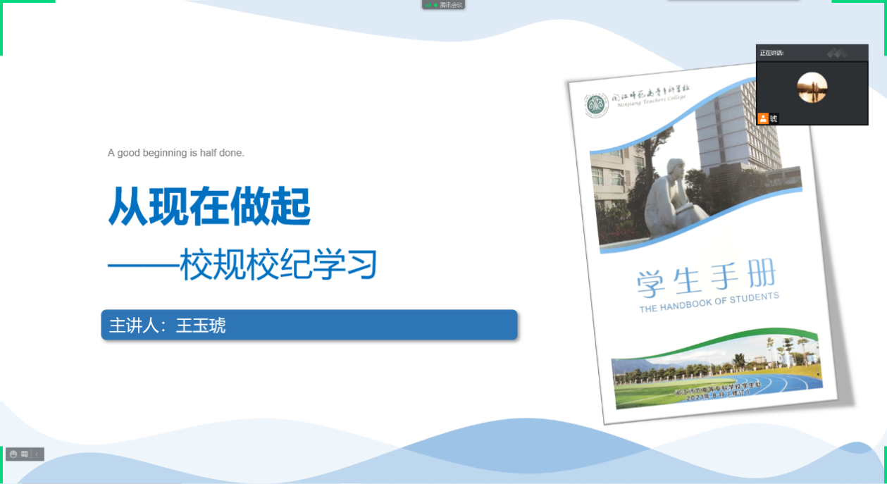 为进一步加强外语系系风、学风建设,强化我系学生的校规校纪意识、行为规范意识,营造良好的学习氛围,外语系2021级全体新生于9月5日晚上通过线上会议的方式开展校纪校规主题教育。此次主题教育由辅导员钱英红老师、王玉琥老师主持。