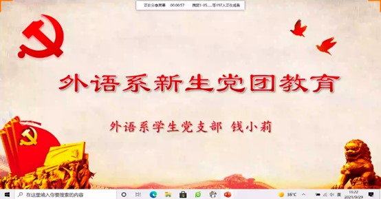 为加强党团建设,提升我校学生的“敬党爱党”精神,增强大学生的党团意识,强化大学生思想政治教育,外语系于2021年9月29日下午16:00通过线上会议形式开展外语系新生党团教育,此次会议由外语系学生党支部书记兼团委书记钱小莉主讲,外语系21级全体新生参加。
