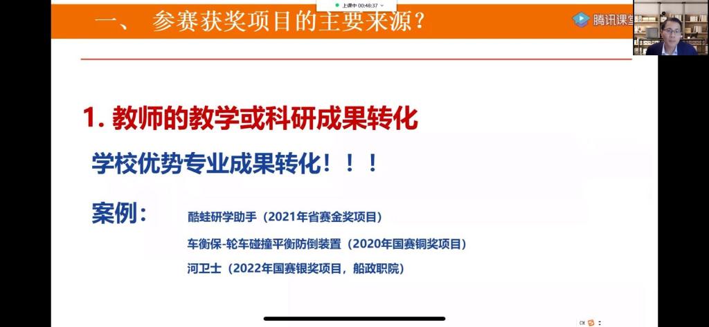 陈言国副教授结合往届“互联网+”创新创业大赛的发展历程,对近三年的大赛主题、大赛流程、评审规则等做了介绍,他通过详实的数据和生动的案例对职教赛道历年获奖作品进行剖析,提出“一个好的项目=好的创意+创新的产品+优秀的团队+强有力的执行”的思想。此外,陈老师提出可以将学校优势、专业成果转化为参赛作品,做到不被自身专业所局限。
