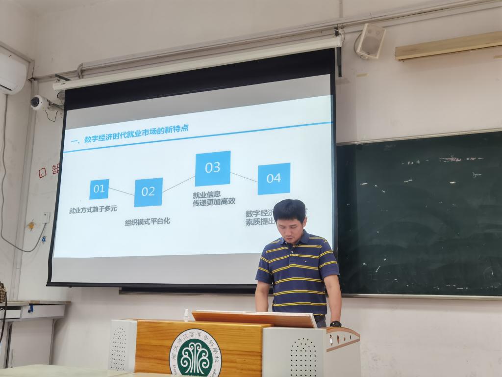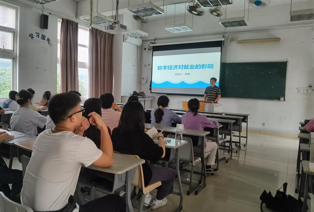 林冉书记在课堂伊始指出,在新冠肺炎疫情的冲击下,数字经济已经成为“稳就业”的重要手段;随后,深入分析数字经济时代就业市场的新特点,并从“扩大就业市场规模、激发企业发展活力、促进就业结构转型、优化就业市场生态”四个层面详细解读数字经济对就业的促进作用;接着,与学生进行互动,让学生结合所学专业谈谈自己的职业规划,课堂气氛活跃。