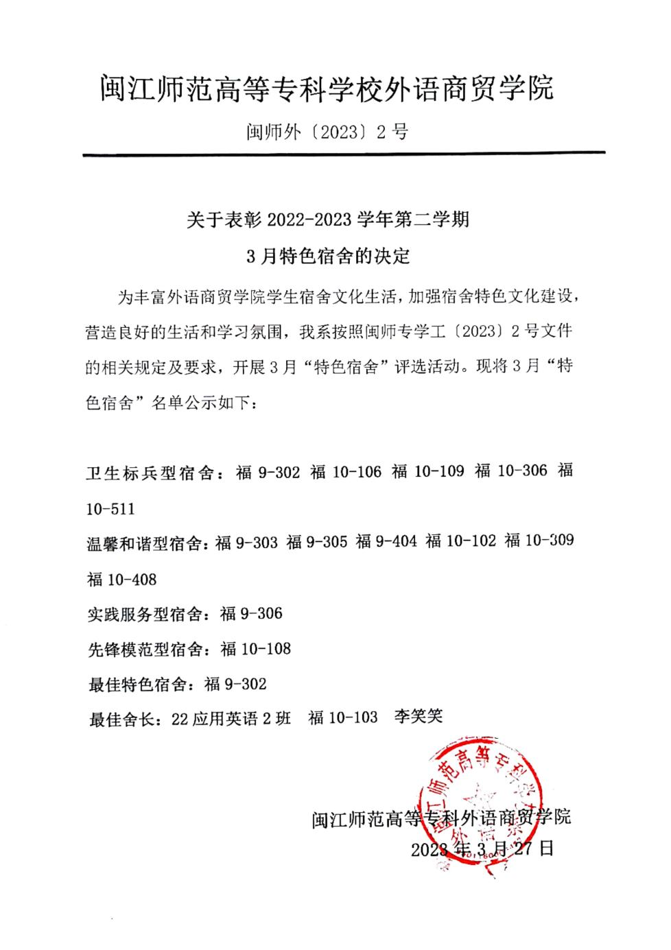 学生寝室是学院精神文明建设的窗口,是学生学习、生活的重要场所。经过了外语商贸学院自律会宿管部负责人和老师的严格评选,最终评选出福9-303等6间“温馨和谐型”宿舍、福 9-302等5间“卫生标兵型”宿舍、 福9-306为“实践服务型”宿舍、福10-108为“先锋模范型”宿舍,福9-302为“最佳特色宿舍”、22应用英语2班,福10-103李笑笑为“最佳舍长”