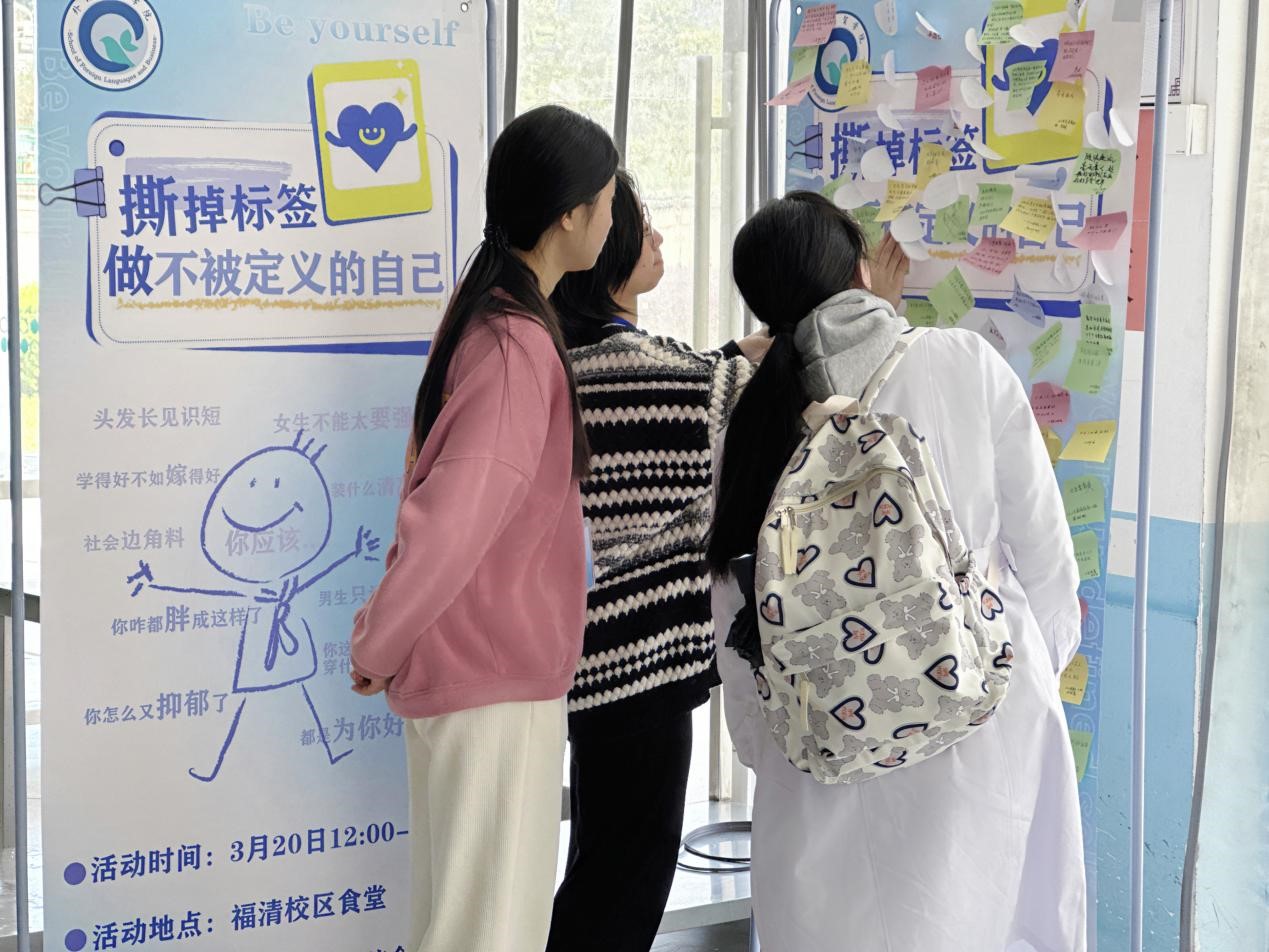 为了帮助同学们提高心理素质,营造良好的校园心理文化氛围,外语商贸学院于2024年3月20日在旗山校区教学楼3-1018门口以及福清校区食堂开展以“撕掉标签,释放自我”为主题的心理健康活动。