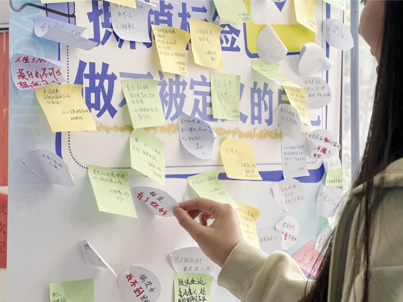 活动现场,同学们热情高涨,纷纷走到海报前,挑选那些他们想要反驳的标签。他们小心翼翼地撕下标签,然后拿起黑色水笔,在便签纸上认真写下自己的观点。