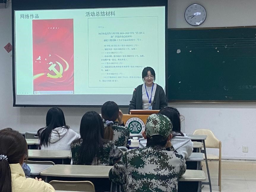培训会议上,叶陈凤同学详细讲解了“活力团支部”创建活动的核心内容,包括“引领力”、“组织力”、“服务力”、“贡献度”、“改革味”和“好作风”六个维度的评分细则。在活动流程方面,她明确了从申报到实施再到总结的各个阶段任务与时间节点。最后,谢心桥学姐给予意见并进行总结,她强调各团支部需结合学院学科特色精心设计活动,按时提交材料,并积极开展宣传工作。
