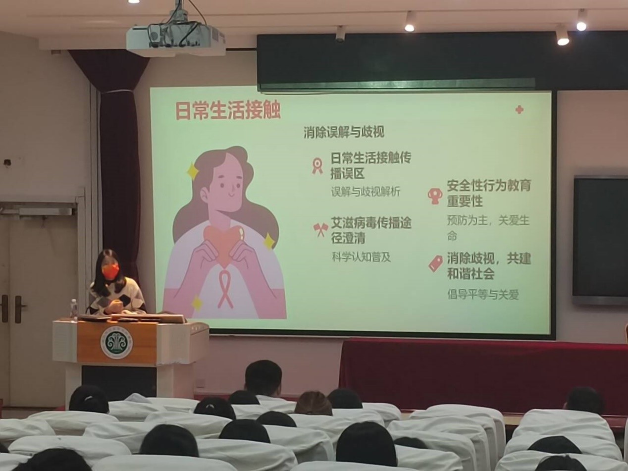 讲座伊始,辅导员们分别从艾滋病的概念、艾滋病的传播途径、艾滋病的症状详情、艾滋病的教育及预防方法等方面,带领同学们认识艾滋病。辅导员叮嘱同学们不仅要保护好自己、关心自己,还要关怀他人,给予他人心理和行动上的慰藉,更要大家将所学的知识运用到实际生活中,积极传播正能量,消除对艾滋病患者的歧视和偏见。最后,辅导员以世界艾滋病日的科普知识作结尾,希望大家共同营造一个关爱、包容的社会氛围。