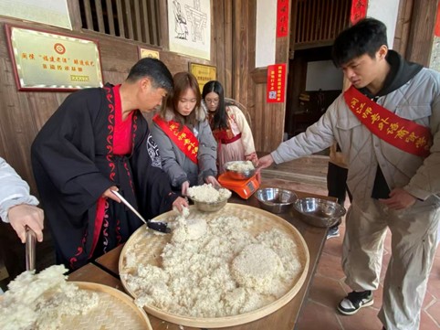 活动中,劳动模范、非遗传承人叶延青董事长亲自为师生讲解青红酒的千年酿造历史,并逐步演示从选米、配曲到蒸煮、发酵、封坛的全套古法工序。他以严谨的劳模风范和专注的工匠精神,手把手指导师生完成摊凉、拌曲、封缸等实操环节,让大家在亲身参与中体会传统工艺蕴藏的匠心与劳动价值,深切感受闽越文化的独特魅力。