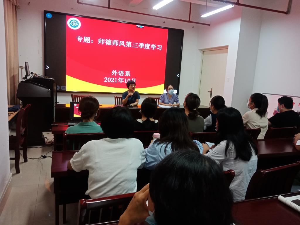 学高为师,德高为范。师德是教师最重要的素质,是教师之灵魂。为进一步加强师德师风建设,提高教师师德修养,2021年10月6日,外语系何少娴主任在旗山校区党员活动室主持召开第三季度师德师风专题学习,外语系全体教职工参会。