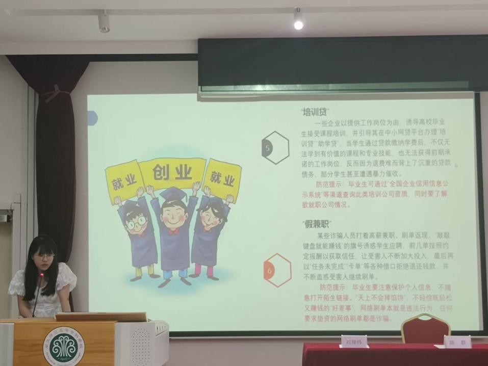 占婷老师引导毕业生们认清形势、转变观念,牢牢把握各类双选会等招聘时机,同时正确把握大学生志愿服务西部计划、三支一扶、特岗教师等基层就业政策,努力将青春绽放在人民最需要的地方,成长成为有理想、敢担当、能吃苦、肯奋斗的新时代好青年。随后,她贴心地为大家推荐了官方可靠的求职方式,并就求职过程中容易遇到的陷阱进行了深入分析。