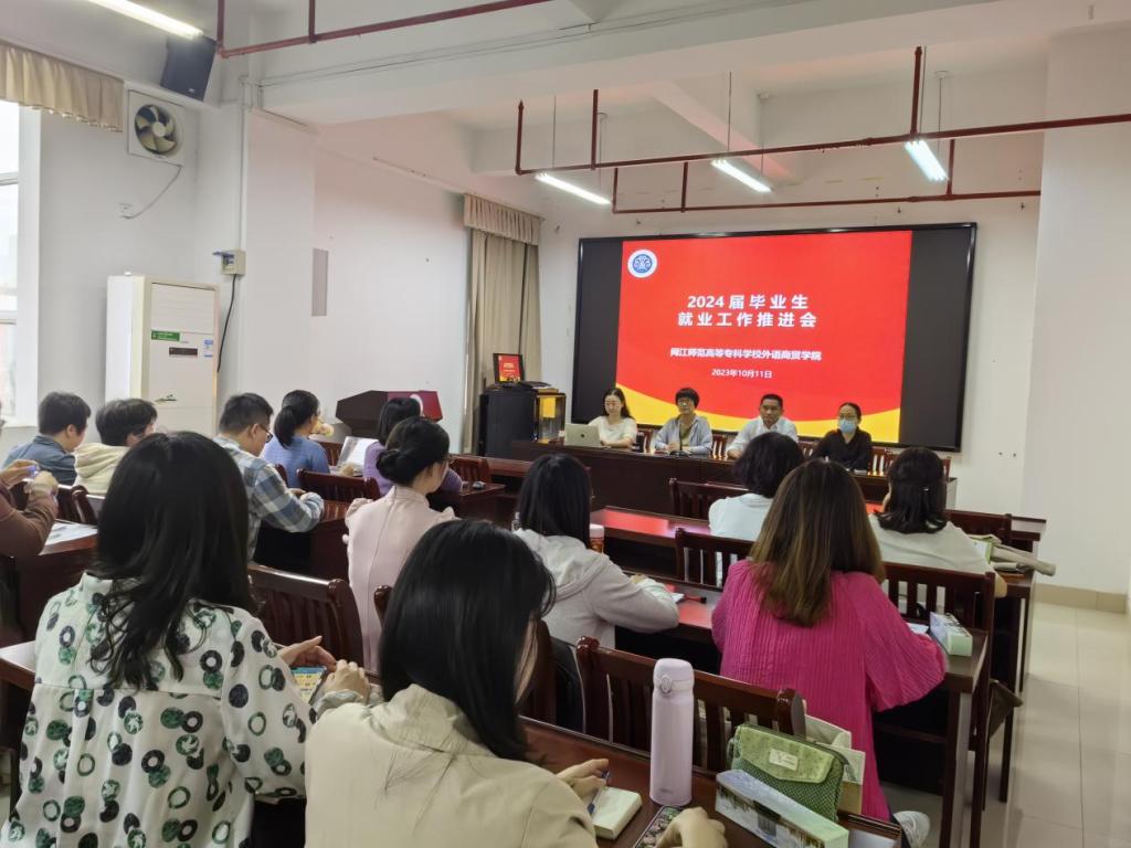 2023年10月11日下午14:30,外语商贸学院开展2024届毕业生就业工作推进会,党总支书记林冉,院长何少娴,党总支副书记卢燕红,副院长陈海燕以及学院全体教职工参加会议,会议由卢燕红副书记主持。