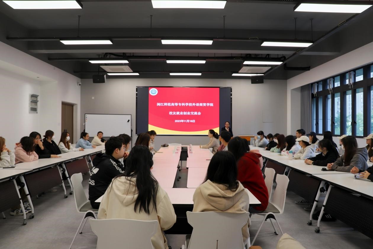 在闽江师范高等专科学校120周年校庆之际,为激发大学生创新创业激情,培养高素质技术技能人才,外语商贸学院于11月18日在旗山校区实训楼301教室举办校友就业创业交流会。本次会议特邀泉州九丰网络科技有限公司总经理苏燕芳,厦门链天好网络科技有限公司招商经理、厦门涂湖厝电子商务有限公司股东胡纯真和福州市花园小学英语教研组长叶磊三位校友回到母校为在校生分享就业创业经验。学院党总支副书记卢燕红、副院长陈海燕、团委书记占婷以及在校生代表参加本次活动。本次活动由卢燕红老师主持、匠心筑梦辅导员工作室承办。