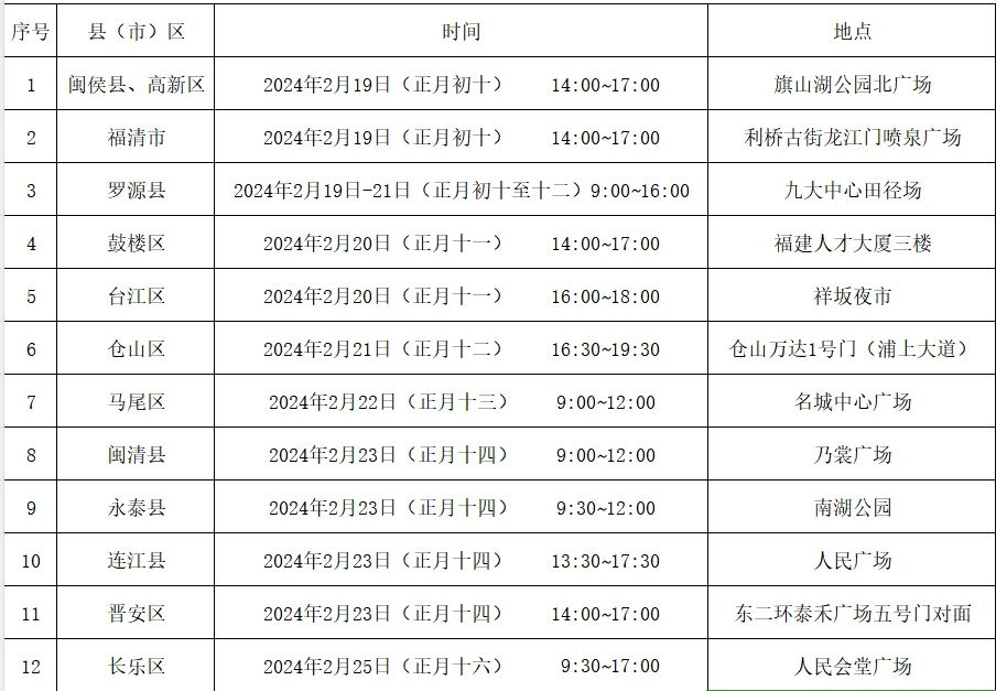 招聘周期间分别在福清利桥古街龙江门喷泉广场、仓山万达广场(浦上大道)、马尾名城中心广场、东二环泰禾广场等地方举办“好年华 聚福州”2024年春季高校毕业生招聘周系列活动。