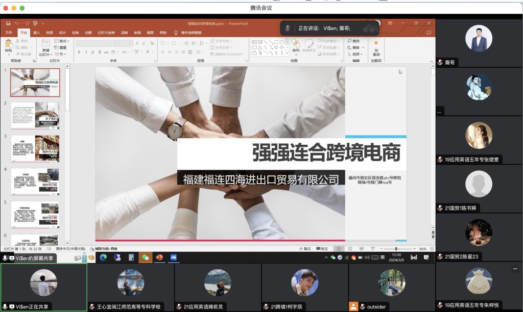 为深入推进2024届毕业生就业工作,帮助毕业生建立初步的就业方向,搭建毕业生和用人单位双向选择的交流平台,2024年3月9日下午,外语商贸学院召开福建建连四海进出口贸易有限公司校园招聘宣讲会。宣讲会于线上开展,我院2019级(五年专)、2021级50余名学生参与,会议由应用外语教研室詹秀萍老师主持。
