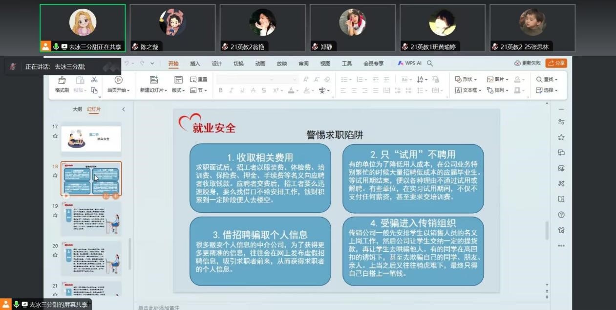 此次就业安全主题教育会上,毕业班辅导员重点分享了四种“求职陷阱”:以各种名义收费来骗取费用、只“试用”不聘用、借招聘骗取个人信息、受骗进入传销组织。通过多个案例的分析,辅导员们提醒广大高校毕业生要提高就业风险防范意识和自我保护能力,警示大家要小心不法分子及无良公司。