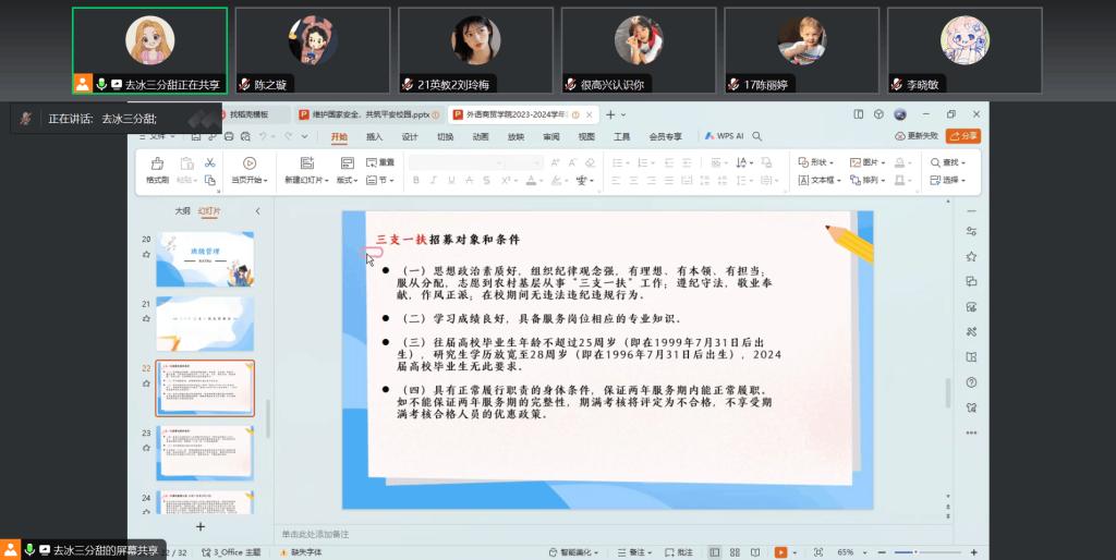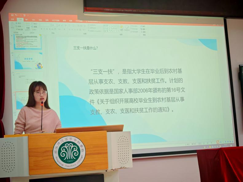 为贯彻落实学校2024届毕业生就业工作实施方案,多措并举助力毕业生高质量充分就业,鼓励和引导更多的高校毕业生投身基层,4月21日,外语商贸学院开展了“2024年‘三支一扶’政策宣讲”主题教育活动。