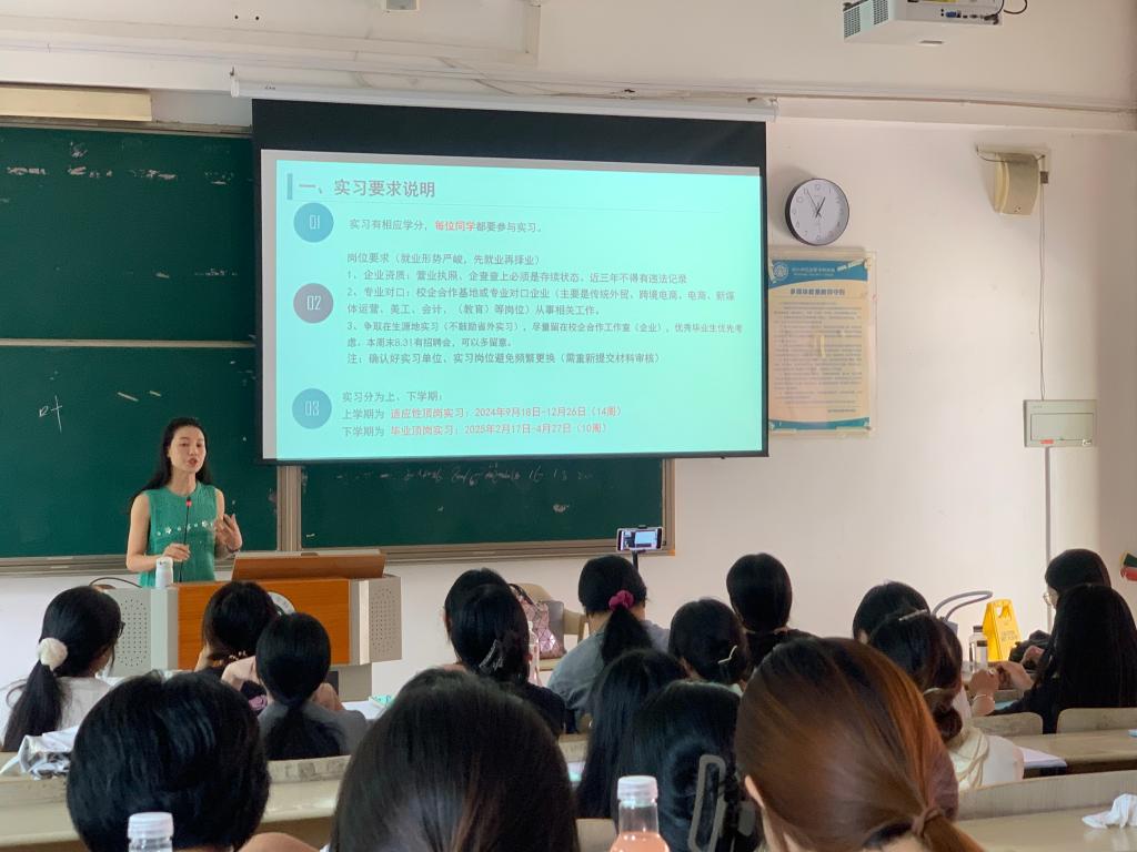 郭瑜婷、詹秀萍两位老师针对实习纪律、实习单位和岗位、实习成绩管理和实习材料的完成方面展开了详细的说明,并强调必须端正态度,遵守实习单位的规章制度,将实习视为职业生涯的重要起点,展现我院学子的良好风貌。