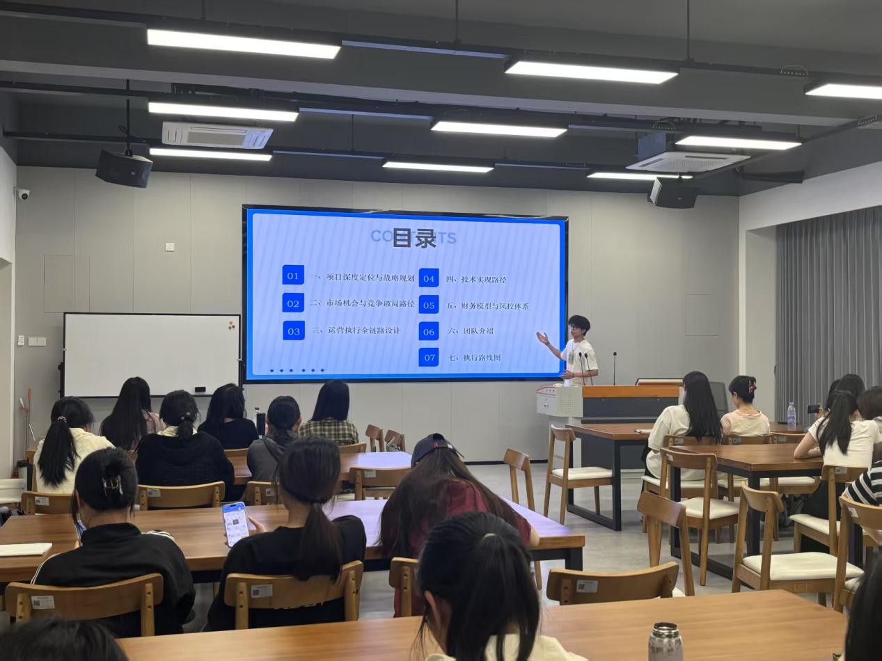 各参赛团队按序上台进行PPT展示,他们准备充分,阐述过程有条不紊。在展示过程中,有的团队运用视频资料,将项目的应用场景生动呈现;有的团队借助精心制作的动画演示,让项目核心更加直观生动;有的团队运用实际案例分析,将项目的落地实施步骤详细呈现,围绕项目核心、团队架构、竞争优势、市场发展潜力等方面展开详细讲解。同学们凭借独特的创意和清晰的规划,展现出扎实的专业素养与创新能力。台下观摩的学生们全神贯注,认真聆听,积极展开讨论,在学习经验的同时,也进一步加深了对创新创业的认知。