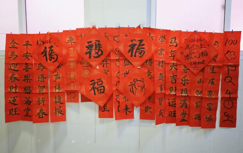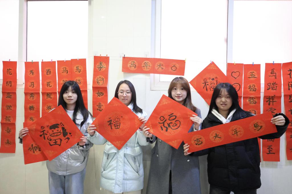 活动采取个人或宿舍组队的形式参与,现场氛围热烈而温馨。活动设置了“自主创作春联”和“创意福字绘制”等环节,同学们或独立构思、专注创作,或相互交流、探讨技法,用毛笔描绘出新年的喜庆景象,作品展现了传统与现代的巧妙融合。现场互动频繁,新年的祝福在笔墨间传递,情谊愈发真挚。