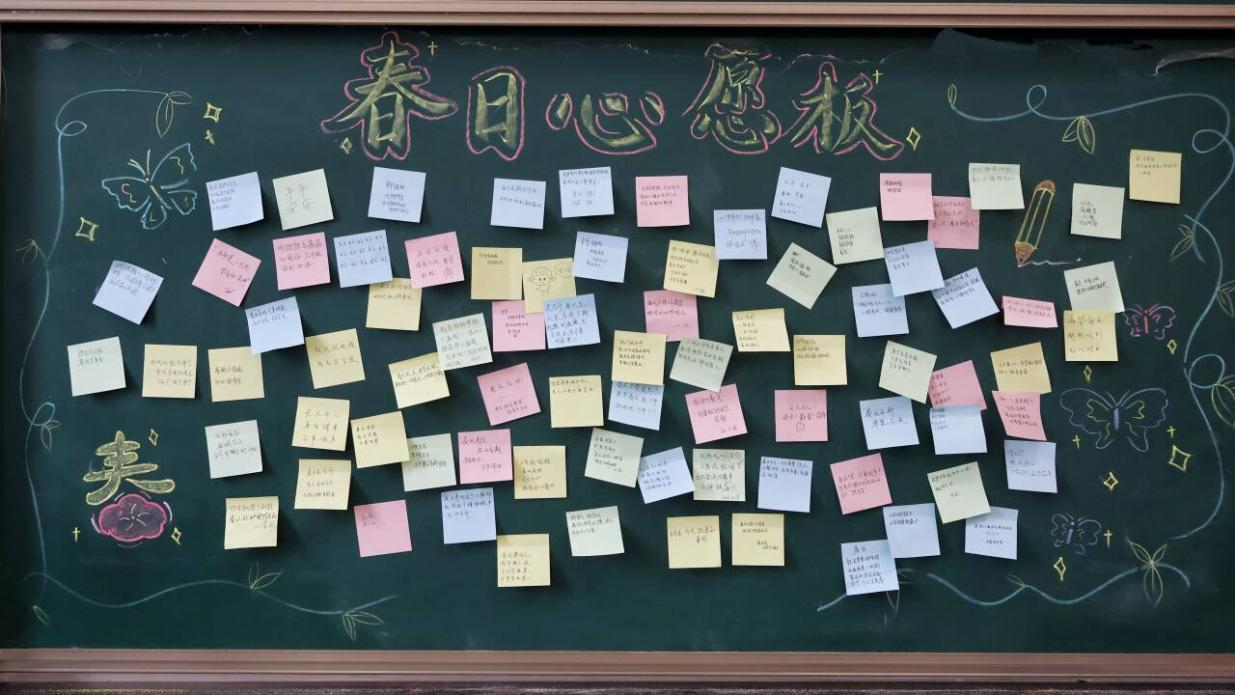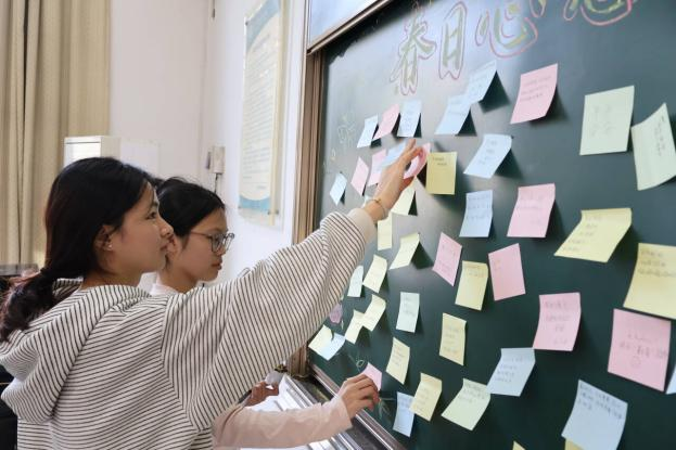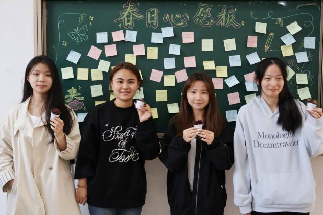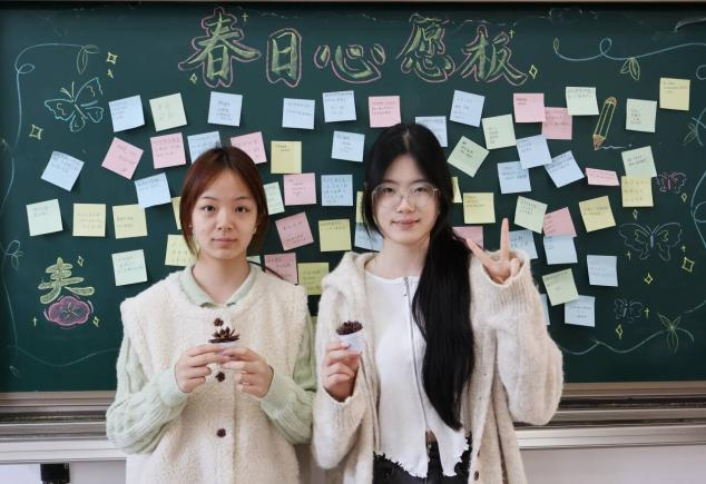 活动伊始,同学们有序进入现场,在工作人员引导下前往春日心愿板,拿起色彩明快的便利贴,认真写下对春日、对未来的各类期许,随后将心愿贴粘贴在黑板上,慢慢汇聚成暖意满满的“春日心愿板”。心愿板上的文字真挚多样,既有贴合学前专业的“以爱育幼,如绿向阳”,有治愈自我的暖心寄语,有诗意盎然的春日感慨,也有“逢考必过、考证顺利”的朴实期盼,不少同学还和心愿板合影,定格这份美好瞬间。