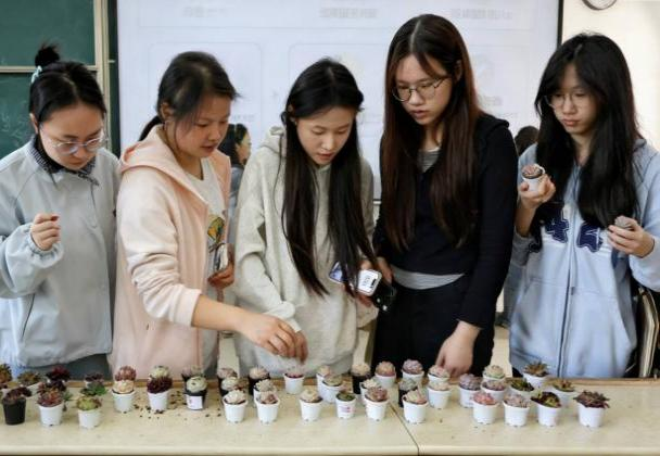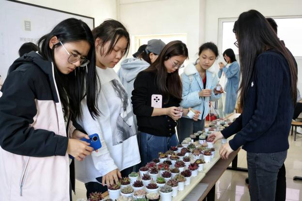 完成心愿粘贴后,同学们移步绿植领养区,挑选心仪的多肉植株。现场准备的多肉品种丰富、形态小巧可爱,同学们逐一挑选,很快找到了属于自己的春日小绿植,现场气氛轻松欢快。挑选过程中,工作人员现场细致讲解多肉养护要点,包括适宜光照、浇水频率、日常打理注意事项等,叮嘱同学们用心呵护绿植,把耐心和细心融入日常养护。同学们认真记录养护技巧,捧着绿植交流心得,尽享绿意带来的美好。